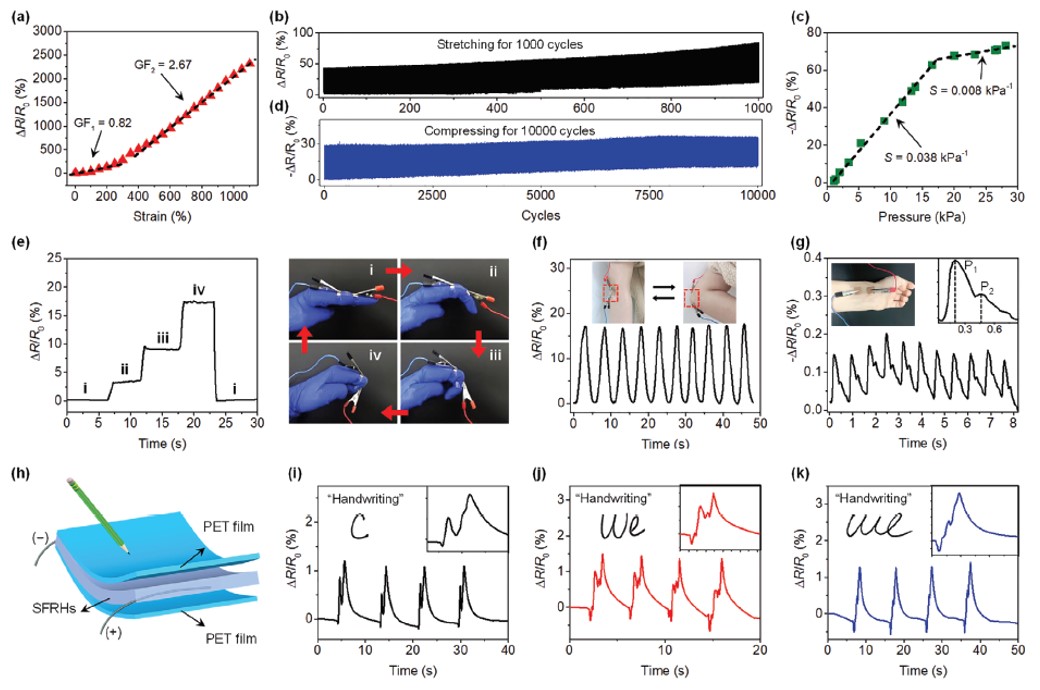 SFRHs在較寬的傳感范圍內(nèi)具有較高的靈敏度和循環(huán)穩(wěn)定性,可用于監(jiān)測人體運(yùn)動和脈搏跳動。SFRHs能夠有效監(jiān)測復(fù)雜而微小的外界刺激,比如書寫字跡等等,這在字跡防偽等領(lǐng)域有重要的潛在應(yīng)用價值。