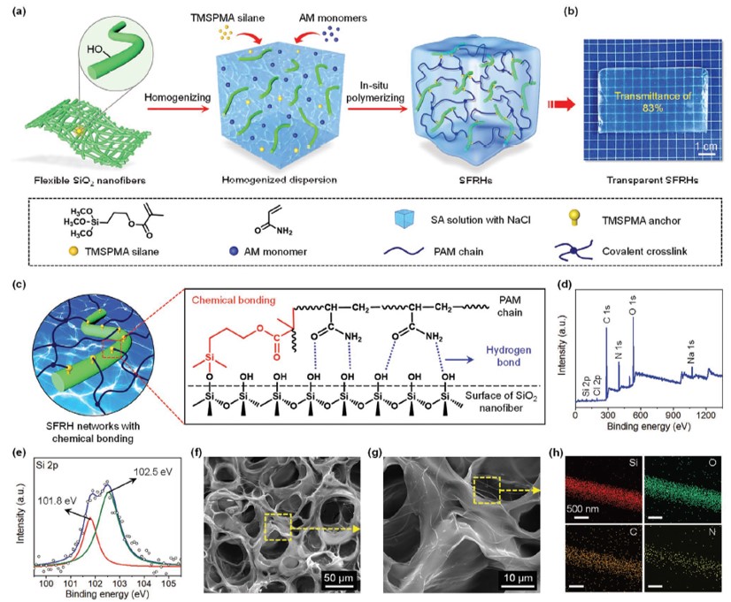 研究團(tuán)隊(duì)將二氧化硅納米纖維、乙烯基硅烷巧妙地整合入海藻酸鈉(SA)/聚丙烯酰胺(PAM)水凝膠中,制備了一種透明納米纖維增強(qiáng)的SFRHs水凝膠,其中PAM鏈通過硅烷共價連接到二氧化硅納米纖維上,形成堅(jiān)固的界面化學(xué)鍵。此外,二氧化硅納米纖維和PAM鏈之間的界面提供了非共價的相互作用(例如氫鍵),在拉伸過程中可能會斷裂和重組,耗散能量并使水凝膠網(wǎng)絡(luò)均勻化。