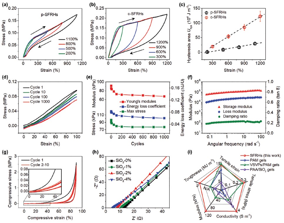 與p-SFRHs的小滯后相比,c-SFRHs在加卸載循環(huán)實(shí)驗(yàn)中表現(xiàn)出更大的滯后,而卸載后的永久變形幾乎可以忽略不計(jì),突出了其韌性和超彈性。經(jīng)過1000次循環(huán)拉伸試驗(yàn)后,c-SFRHs的楊氏模量、最大應(yīng)力和能量損失系數(shù)均沒有顯著下降。與脆性的傳統(tǒng)水凝膠相比,SFRHs顯示出強(qiáng)大的壓縮回彈性和高壓縮應(yīng)力(90%應(yīng)變時為2.6 MPa)。此外,它們可以在如此大的應(yīng)變下被反復(fù)壓縮而不會發(fā)生結(jié)構(gòu)坍塌。另外,實(shí)驗(yàn)發(fā)現(xiàn)隨著二氧化硅納米纖維含量的增加,阻抗逐漸降低,表明SFRHs的離子電導(dǎo)率呈不斷增加的趨勢。離子電導(dǎo)率的提高歸因于兩個效應(yīng):首先,非導(dǎo)電性二氧化硅納米纖維在復(fù)合水凝膠中占有較小的體積,確保了離子在水中的高遷移率。其次,具有高長徑比和酸性表面(-OH基)的二氧化硅納米纖維吸引反離子,在整個水凝膠中形成一個連續(xù)的高導(dǎo)電通道。